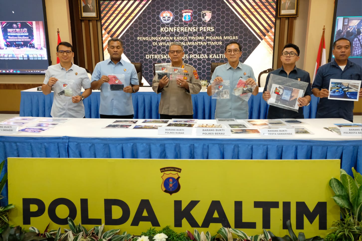 Konferensi pers tersebut dipimpin langsung oleh Kabid Humas Polda Kaltim Kombes Pol Yuliyanto, S.I.K., M.Sc., didampingi Ditreskrimsus Polda Kaltim Kombes Pol Dr. Bambang Yugo Pamungkas, S.H., S.I.K., M.Si., serta Kasubdit Indagsi Ditreskrimsus Polda Kaltim AKBP Haris Kurniawan, S.I.K., M.I.K.